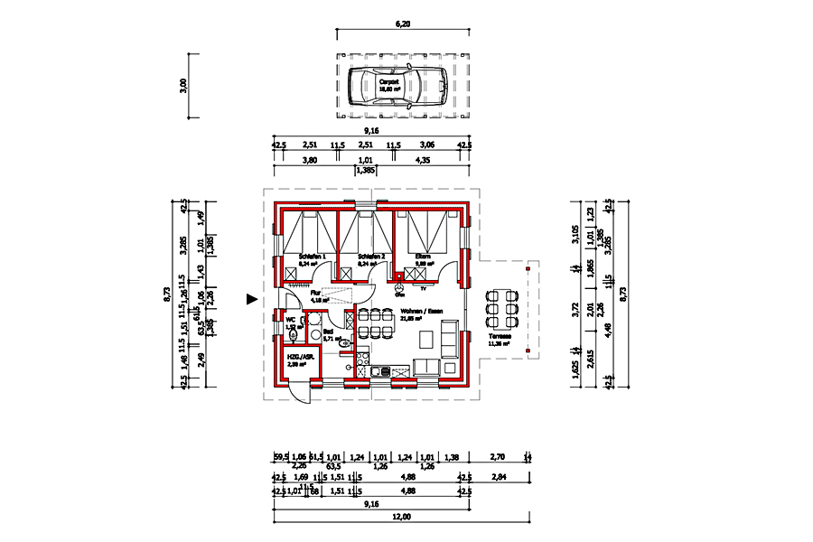Unser Ferienhaus Texas bietet drei Schlafräume, eine Wohnküche, ein großes Bad mit begehbarer Dusche und ein separates WC.
