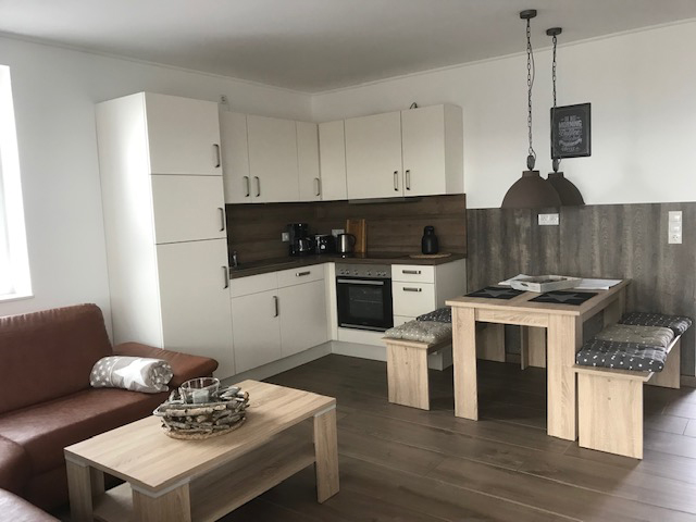 Die mit allem Komfort ausgestattete Küche (Kühlschrank, Spülmaschine, E-Herd mit Backofen u. Mikrowelle) steht ebenso wie ein Wasserkocher, eine Kaffeemaschine und ein Toaster zur Verfügung. Töpfe, Pfanne, Gläser, Besteck und Porzellan gehören natürlich auch dazu.