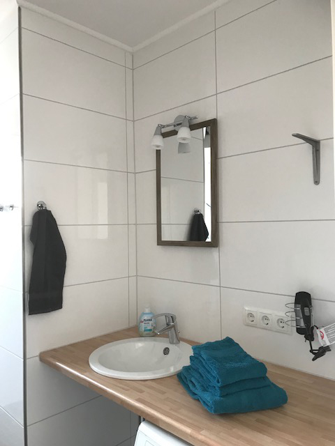 Im Bad befindet sich auch die Waschmaschine, die gegen eine geringe Gebühr gern genutzt werden kann.