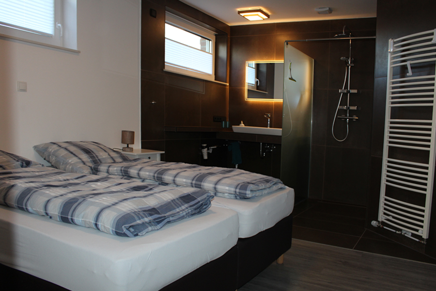 Modern und hochwertig eingerichtet finden Sie hier eine begehbare Dusche, ein Waschbecken, ein WC. Für die Kleinen steht ein Hocker bereit. Fußbodenheizung und Handtuchheizung im Schlafzimmer/Bad unten vorhanden. Handtücher können gegen Gebühr hinzu gebucht werden.