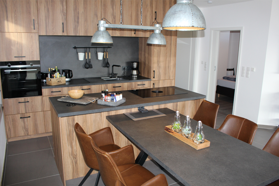 Die moderne Küche ist komplett ausgestattet mit mit dem BORA-System sowie Kühlschrank inkl. großem Gefrierfach,